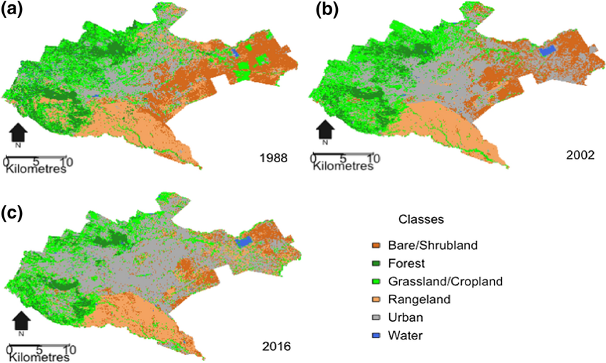 The declining cover of Nairobi’s green spaces between 1988 and 2016. Source: Reserch Gate.